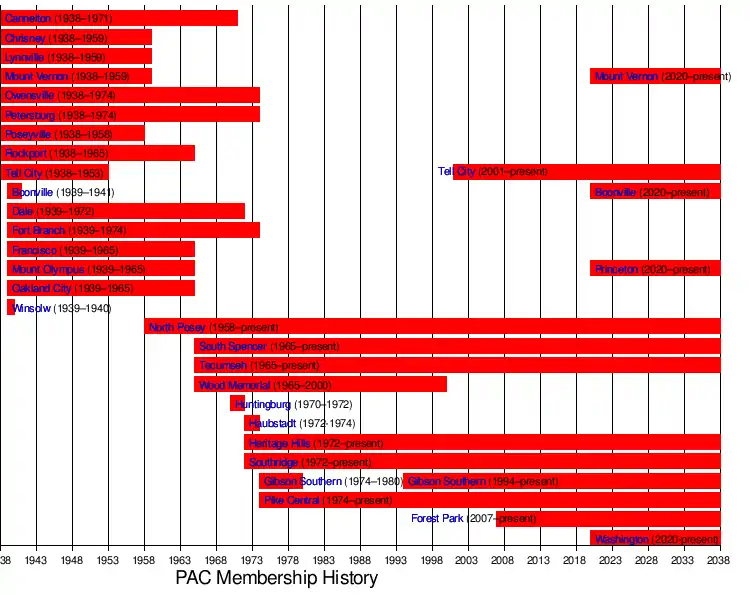 The first current member appeared in 1958 when Poseyville consolidated with Cynthiana, Griffin, and Wadesville to form North Posey. Rockport merged with Richland in 1965 to form South Spencer. Elberfeld merged with former member Lynnville in 1965 to form Tecumseh. Also in 1965, Oakland City and Francisco, both of which joined the PAC in 1939, joined to become Wood Memorial. Dale, which had joined in 1939, joined with another former member, Chrisney, to form Heritage Hills in 1972. Huntingburg joined the PAC in 1970 from the SIAC and in 1972 consolidated with Holland to become Southridge. In 1974, Owensville consolidated with Fort Branch and Haubstadt into Gibson Southern. Both Fort Branch and Owensville were members of the PAC at the time. Haubstadt was also briefly a member of the PAC. That same year Petersburg joined with Winslow, Otwell, and Stendal to form Pike Central.