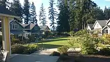 The term "pocket neighborhood" was coined by architect Ross Chapin.[3] In 1995, Chapin partnered with The Cottage Company founder Jim Soules to build the first contemporary pocket neighborhood, the Third Street Cottages, in the city of Langley on Whidbey Island in Puget Sound.[4] The Third Street Cottages, a collection of 8 modest 650–1,600-square-foot (60–149 m2) cottages,[2] were developed to take advantage of Langley's cottage ordinance,[5] where zoning allowed for double density housing "if the homes were limited to 975 square feet".[2]