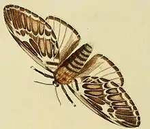 The wingspan is 65 mm. The forewings are white, the markings light olivaceous brown. There is a small black spot at the base below the median and a broad median shade, darkest along the upper portion of the cell, crossed by whitish shades between the veins and limited by a broad white post-medial line, which is followed by cuneiform streaks and spots. There is also a terminal row of spots between the veins. The hindwings are white, the space below the cell and inner margin shaded with olivaceous brown. There are also some faint terminal spots.[2]