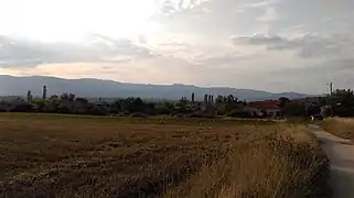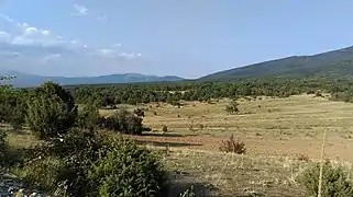 Panorama showing the Baba mountains (west), Podmočani (centre-east) and in the distant background Grnčari village, Lake Prespa and the Galičica mountains (centre-west)