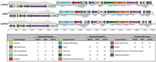 The double stranded DNA genome is linear, around 40-42kb in length,[1] and encodes ~55 genes. The guanine + cytosine content is ~50%. It has terminally redundant sequences and is nonpermuted. By weight, the genome constitutes ~50% of the viron. The genome encodes 9 structural proteins, an adenylated transferase B type DNA polymerase and an RNA polymerase. Three internal proteins constitute the polymerase complex. Two classes of genes are recognized (early and late). This classification is based on the timing of transcription that is temporally regulated. Genes with related functions are clustered together. Genome replication is bidirectional.