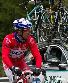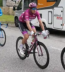 ![]() Arnaud Démare in the cyclamen jersey of classification leader at the 2019 Giro d'Italia | |