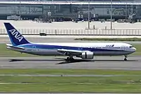 After the appearance of Pokémon in 1996, and the resultant Pokémon-related craze, All Nippon Airways unveiled the first Pokémon Jets on 1 July 1998, timed with the release of Pokémon: The First Movie.[1][2] The first two to be unveiled were a Boeing 747-400D (JA8965) and a Boeing 767-300 (JA8569), and each displayed a number of the then 151 Pokémon characters, including Pikachu. Due to the popularity of the aircraft, a second 767 was unveiled a matter of weeks later.[1] The three aircraft were introduced on numerous domestic flights in Japan.[3][4][5] A fourth aircraft, a Boeing 747-400, was painted in a Pokémon livery in February 1999, and was called the US version by the airline, as it was put into service on the airline's North American network. The aircraft was identical to the previous three aircraft, except the letters ANA were kept on the vertical stabiliser,[1] and operated its first flight to New York City's JFK International Airport on 24 February 1999.[6][7]