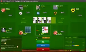 PokerTH is an open-source Texas hold 'em simulator that runs on Windows, Mac OS X, Linux, and Android. PokerTH is written in C++ using the Qt framework and allows for up to ten human players, with computer-controlled players filling in if there are not enough humans. Players can also play against other PokerTH users online.[1] The game has ample settings so that players can configure and customize play.[2]