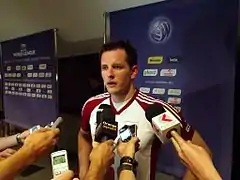 On 24 October 2013, was announced new head coach Stéphane Antiga.[32] He began his work after the end of the league season 2013/2014, because he played for PGE Skra Bełchatów and he had to complete his career as a player. His first tournament as Poland's head coach was the CEV European Championship 2015 qualification. Poland won 5 out of their 6 matches, beating Macedonia and Latvia twice each and Slovenia once. The Polish national team qualified for the CEV European Championship 2015.[33]
