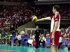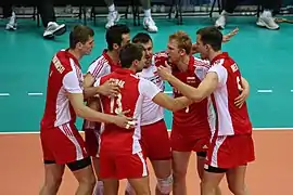 On 30 August 2014, Poland played their historic match at the National Stadium in Warsaw against Serbia as opening meeting of the 2014 World Championship.[38] It was the opening match of the World Championship 2014 in Poland.[39] Polish team won 3–0 and with attendance over 62,000 audience.[40] In their first group, Pool A, Poland won all 5 matches and lost just one set with Cameroon. In their second group, Pool F, the host team won 3 of their 4 matches. On 10 September 2014, they lost to the United States (1–3), but then beat the national teams of Italy (3–1), Iran (3–2) and France (3–2).[41] Poland took second place in Group F. The breakdown in the next stage of the tournament was decided by drawing lots. Poland went into group H with Brazil and Russia. Some commentators and fans called Pool H the "Group of Death", but it was a happy result for the home team. The Polish national team won two dramatic matches after tie-breaks at Atlas Arena in Łódź. On 16 September 2014 they beat Brazil. Poland's main scorer in the match was Mariusz Wlazły, who gained 31 points for his team.[42] Two days later, Poland needed just two winning sets for promotion to the semi-final. Poland beat Russia and took first place in the group.[43] On 21 September 2014 the Polish team won the semi-final match against Germany, which guaranteed for Poland their third ever medal at the World Championship.[44][45][46] On 21 September 2014 Poland won the title of World Champion 2014, for the first time in 40 years.[47] Poland beat Brazil (3–1).[48][49] Polish players received 3 of 8 the individual awards in the tournament: Karol Kłos as Best Blocker, Mariusz Wlazły as Best Opposite and Most Valuable Player.[50][51] After victory Poland have risen two places in FIVB ranking and has been taken 3rd place.[52]