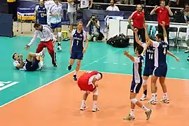 Polish players started their visit in Japan from training camp in Osaka and then they went to Hammamatsu, where they are playing their first round matches. Poland started a journey at World Cup 2015 on 8 September, when they beat Tunisia (3–0). In following day, Polish players beat Russia (3–1) and in both matches Most Valuable Player of match was chosen Bartosz Kurek.[68] During third set of the meeting with Russia, Polish setter Grzegorz Łomacz twisted his ankle. On 10 September 2015 Poland contained their winning with Argentina (3–1) and MVP was Michał Kubiak. On 12 September, Polish team beat Iran (3–2) and best player on the court was chosen Mateusz Mika. On 13 September Poland played their last match in first round in Hamamatsu with Venezuela (3–1). MVP of match was Dawid Konarski, who scored 22 points. Poland won all five matches in first round of World Cup 2015, but lost one point in overall table. In second round Poland beat Canada (3–1), Egypt (3–0), and Australia (3–0). After eight victories without any defeat, Poland moved to Tokyo.[69] On 21 September 2015, two previously undefeated teams met in first match of third round. Poland beat United States (3–1) and Polish captain Michał Kubiak played his best match in World Cup. Then Poland won match with host team Japan, but they had problems with them in first set (3–1). Poland won 10 of 10 matches and the last day on 23 September met with Italy. They lost 3–1 and they did not achieve one point so Poland took 3rd place in tournament, which did not give Poland a qualification to 2016 Summer Olympics.[70] Poland won 10 of 11 matches, but because of points and ratio of set, achieved only bronze medal without Olympic qualification.