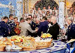 Pole Chudes (Russian: По́ле Чуде́с, IPA: [ˈpolʲɪ tɕʉˈdʲes], lit. The Field of Wonders) was a Russian adaptation of the U.S. game show Wheel of Fortune (loosely based on the original format; the license wasn't bought from the distributor) produced by VID, provided with elements of Russian culture and hosted by Leonid Yakubovich. Current rating of the show suggests it is intended for ages 16 and above, unlike the American version which is suitable for all age groups. Channel One Russia currently intends to stop buying Pole Chudes from VID and replace it with a licensed version of Wheel of Fortune under the same name since January 2022.[1] Originally, due to a trademark dispute with VID, the title of the new show was supposed to be Nashe Pole Chudes, however, VID later agreed to let Channel One keep the original Pole Chudes name and the full 31-year archive, while Channel One will be producing the new reboot of the show as a licensed spin-off of Wheel of Fortune.[2]