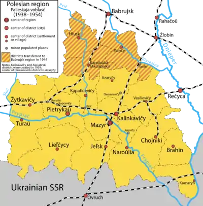 Polesia Voblast (Belarusian: Палеская вобласць, Russian: Полесская Область) was an administrative division in the Soviet Belarus. It was created on January 15, 1938. It included the territories of eastern Polesia and consisted of 15 raions. The Center of Polesia Voblast was the town of Mozyr.