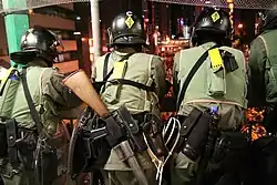 The Police Tactical Unit (PTU; Chinese: 警察機動部隊) is a unit within the Hong Kong Police Force which provides an immediate manpower reserve for use in large-scale emergencies.[1] Unit companies are attached to all land Regions and are available for internal security, crowd control, anti-crime operations, disaster response and riot control throughout Hong Kong. The PTU is often referred as the 'Blue Berets', which is in reference to the blue berets worn as part of the uniform. The PTU base and training camp is located in Fanling.