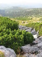 The fauna to be met on the trail is relatively poor due to the fact that the region was long ago penetrated by human beings. Bears, volves, once numerous, especially in the pass areas, are extinct. Badgers, mouflons occur relatively rarely, especially in the topmost regions along the trail. One representative of alpine fauna is the mountain shrew.[11] The world of birds is much richer, comprising among others black grouse, Tengmalm's owl, alpine accentor,[12] water pipit, common redpoll, Western Capercaillie.[13] Numerous nonvertebrates also occur in the alpine zone.