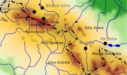 Until the Middle Ages, the peak area of Karkonosze remained untouched; the first people to explore it were treasure hunters looking for gold, and shepherds. Already in the 18th century ascents to the Sněžka/Śnieżka were fairly common, albeit the forms of organised tourism appeared in the second half of 19th century, along with railway access to Jelenia Góra, Szklarska Poręba and Karpacz. Before the rush time for Karkonosze, Śnieżka/Schneekoppe was climbed amongst others by Johann Wolfgang von Goethe.[1] In that period many shepherd's huts were built, called in German Baude and bouda in Czech. Some of them were developed later in mountain huts, which exist even now, e.g. Lucni Bouda. Due to the industrial revolution and the period of prosperity tourism and hiking became popular. This was about the time, when the whole network of roads and trails, altogether ca 300 km, was constructed in both Silesian and Bohemian parts of the mountains.[2] The whole idea was conceived, implemented and managed by two mountain clubs, Austrian Riesengebirgenverein and German Riesengebirgenverein. All the main paths and trails, including these in the alpine area, had been constructed before World War I. The trail, later dubbed Polish-Czech Friendship Trail, was completed before the end of the 19th century.[2] At the beginning of the 20th century, both the Silesian and now Polish part as well as the Bohemian and now Czech part of the region were inhabited by Germans, and the upper zones of the range were a busy tourist region with numerous huts and other facilities.