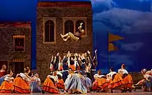 During the Second Polish Republic, Nijinska headed the Balet Polski, aka Les Ballets Polonais, aka The Polish Ballets newly formed in Warsaw in 1937.[20][21][22][23] This company was the brainchild of poet Jan Lechoń, and created with the assistance of M. Waclaw Jedrzejewicz, Minister of Public Education and President of the Organization Committee of the Polish Section to the Art and Technical Exhibition in Paris. The company's general director was Arnold Szyfman. For the first season, 1937-1938, Nijinska created five new ballets including Baśń krakowska (La Légende de Cracovie), to music by Michal Kondracki; Pieśń o ziemi naszej (Le Chant de la Terre), to music by Roman Palester; Koncert E-moll Chopina (Concerto de Chopin), to Frédéric Chopin's B-minor piano concerto; Apollo i dziewczyna (Apollon et la Belle), to music by Ludomir Rozycki; and Wezwanie (Le Rappel), set to a score by Boleslaw Woytowicz. This repertoire featured scenery and costumes designed by Teresa Roszkowska, Waclaw Borowski, Wladyslaw Daszewski, and Irena Lorentowicz-Karwowska. The souvenir program for this company's Covent Garden appearances states: "Every gesture and every colour, the ebb and flow of the groups, each step of the soloists, the spirit and harmony of the Polish Ballets are imbued with the artistic ideals of Bronislava Nijinska and her ardent desire that the world should see the dances of her country in their noblest and most beautiful form."[24] At the Paris Exposition Internationale of that year, this Polish Ballet won the Grand Prix for performance, Nijinska the Gran Prix for choreography.[25][26] In 1938 the Ballets Polonais was directed by Leon Wójcikowski. It appeared at the New York World's Fair in 1939, but World War II caused its closure.[27]