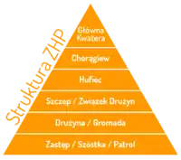 The basic unit of ZHP is a drużyna (troop), consisting of approximately 30 boys or girls. Each drużyna is formed by several units named zastęp (patrol) consisting of about seven people. A few troops (especially working at the same school or housing estate) can be connected in one szczep (group). Several groups or/and troops from a specified area (borough, village, town) form a hufiec (district) which in turn is a part of one of the regions called chorągiew (literally banner). For example, a particular Scout can be a member of
