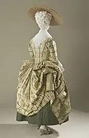 Aileen Ribeiro describes the polonaise as "cut in four parts, two at the front and two at the back,"[6] with the bodice closed at the top center front and sloping away at the sides, leaving a triangular gap that was filled by a false waistcoat. Sleeves could be three-quarter length or long, and various styles such as the Irish, Italian and French polonaise were described by contemporaries.[6] A variation on the robe à la polonaise was the robe à la circassienne, cut the same but trimmed with "oriental" tassels or fur.[9]