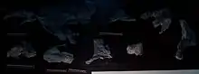 The centrum of the atlas vertebra is the only part preserved, and has a crescent shape and rounded anterior surface. The other two vertebrae have centra longer than they are tall. The axis has a triangular neural spine and relatively small prezygapophyses, at least compared to the stout postzygapophyses. The third cervical vertebra has an incomplete neural spine and equally sized post- and prezygapophyses. The caudal vertebrae have pronounced facets for the haemal arches, and tall plate-like neural spines. The centra have smooth convex ventral surfaces, and as the vertebrae are fairly large, they probably come from the anterior part of the tail.[2]