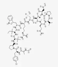 2-[(3R,6S,9S,10R,13R,16S)-6-(3-amino-3-oxopropyl)-9-[[(2S)-2-[[(2S)-2-[[(2R)-2-[[(2S)-2-[[(2R)-2-[[(2S)-1-[(2S)-3-(4-bromophenyl)-2-[[(2R)-2-formamidopropanoyl]amino]propanoyl]pyrrolidine-2-carbonyl]amino]-3,3-dimethylbutanoyl]amino]-3,3-dimethylpentanoyl]amino]-3-(1H-indol-3-yl)propanoyl]amino]-5-(diaminomethylideneamino)pentanoyl]amino]-3-sulfopropanoyl]amino]-7,10-dimethyl-2,5,8,12,15-pentaoxo-3-propan-2-yl-11-oxa-1,4,7,14-tetrazabicyclo[14.3.0]nonadecan-13-yl]acetic acid | |