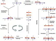 Polymerase-endonuclease amplification reaction (PEAR) is a DNA amplification technology for the amplification of oligonucleotides.[1][2] A target oligonucleotide and a tandem repeated antisense probe are subjected to repeated cycles of denaturing, annealing, elongation and cleaving, in which thermostable DNA polymerase elongation and strand slipping generate duplex tandem repeats, and thermostable endonuclease (PspGI) cleavage releases monomeric duplex oligonucleotides.