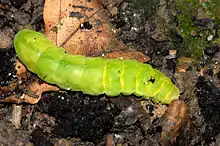 The larvae feed on various grasses, such as mint, Taraxacum officinale, Senecio, Fireweed and at times even fruit bearing trees.