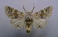 A. flavicincta F. (= flavicincta-major Esp., dysodea Esp. nec Hbn.) (33 c, d). Forewing pale grey speckled with darker olive grey, especially in median area; the edges of the stigmata, the course of the basal and submarginal lines, and vein 1 marked by orange scales; lines dark olive; upper stigmata paler; the claviform darker; median shade distinct; hindwing grey, darker in female, with veins, cell spot, outer line, and submarginal shade darker; the species varies in depth of colour; the darker forms are known as ab. meridionalis Bsd. (33 d) from Spain and Corsica; — calvescens Bsd. (33 d) [ Polymixis rufocincta calvescens (Boisduval, 1840) ] on the other hand is a pale grey form with the yellow scaling , all but obsolete, occurring in S. France, Italy, and Sicily; ab. albescens ab. nov. (33 d) is dull white, without grey dusting except in median area, the upper stigmata also whitish; hindwing paler. Larva pale bluish green, with a darker dorsal vessel and broad pale spiracular stripe; head green. [1] The wingspan is 40–50 mm. The length of the forewings is 17–22 mm.