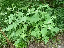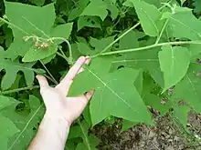 Polymnia canadensis, commonly known as "bears foot" or "small-flowered leafcup", is more easily identified by features other than the small flowers which are present only in the late summer. Often it grows in stands of several plants clustered together. The leaves vary in shape from deeply lobed leaves at the lower part of the plant to the simple leaves at the upper part of the plant (see photo). The sap is clear, sticky and pleasantly fragrant.[6]
