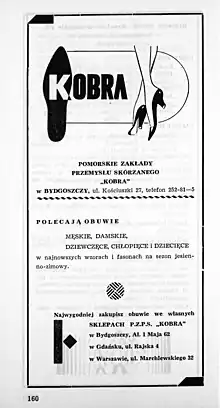 In 1948, the conglomerate (Pierwsza Państwowa Fabryka Skór-State Leather Factory No.1) has been employing 246 people and in 1954 - 1674 people, among whom 1050 women.[17] In the 1950s, the company was merged into the State Leather Industry Department based in Łódź. In 1956, the (ex-"LEO") factory at Chocimska street was expanded.[18] Furthermore, the conglomerate was re-branded Pomeranian Leather Industry Plant "Kobra" (Polish: Pomorskie Zakłady Przemysłu Skórzanego-PZPS "Kobra") in 1960.[3]