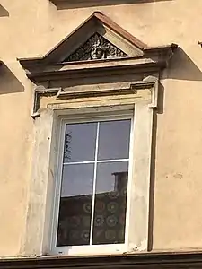 The facade displays many architectural details: - a gate flanked with pilasters with corbels; - 1st floor windows topped with curved pediments, adorned with vegetal motifs; - 2nd floor windows feature rectangular pediments, with ornaments. A series of corbels tops the elevation.