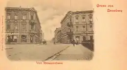 In 1867, with a new territory extension of the city, the whole street was comprised within the municipal area.[3] Its northern tip "Verlängerte Rinkauerstraße" (Extended Rinkauer street) was the location of Prussian army barracks, German: Kaserne Rinkau:[4] the Infanterie-Regiment Nr. 148 was part of the 41st Division in the pre-World War I organization.