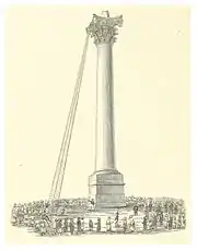The monument stands some 26.85 m (88.1 ft) high, including its base and capital, and originally would have supported a statue some 7 m (23 ft) tall.[2][8][1][lower-alpha 1] The only known monolithic column in Roman Egypt (i.e., not composed of drums),[10] it is one of the largest ancient monoliths and one of the largest monolithic columns ever erected. The monolithic column shaft is 20.46 m (67.1 ft) in height with a diameter of 2.71 m (8 ft 11 in) at its base, and the socle itself is over 6 m (20 ft) tall.[11][2] Both are of lapis syenites, a pink granite cut from the ancient quarries at Syene (modern Aswan), while the column capital of pseudo-Corinthian type is of grey granite.[2] The weight of the column shaft is estimated to be 285 tonnes.[11]
