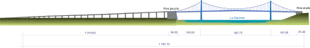 The Pont d'Aquitaine's central span, 393.75 m, is the second largest French suspension bridge behind the Pont de Tancarville, remains a modest work. In 2008, it ranked 80th in the world of suspension bridges. However, it is extended on the left bank by a viaduct of 1014 m, which brings it to the 8th rank in terms of length of French bridges when all categories combined.