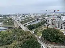 The Pont de l’Harteloire is a bridge in Brest, France. Upstream of the Pont de Recouvrance, it connects the two banks of the river Penfeld and overlooks the arsenal de Brest. It is on the site the naval transporter bridge was destroyed during the Second World War.