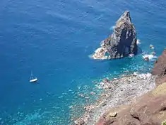 Ponta dos Rosais is situated 200 metres (660 ft) above sea level on the extreme northwestern tip of the island of São Jorge.[2] The waters around Ponta dos Rosais consist of an oceanic plateau known as Baixa da Ponta dos Rosais: this plateau extends out north-northwest from the promontory.[2] The islands of Faial, Pico, and Graciosa are often visible from Ponta dos Rosais. Faial and Pico are located approximately 15 kilometres (9.3 mi) from Ponta dos Rosais.[2]