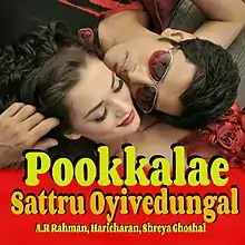 "Pookkalae Sattru Oyivedungal" (transl. Oh flowers... Rest a while) is a romantic Tamil song from the 2015 Tamil film, I. Composed by A. R. Rahman, the song is sung by Shreya Ghoshal and Haricharan, with lyrics penned by Madhan Karky.[1] The music video of the track features actors Vikram and Amy Jackson.[2] The song was re-dubbed in two other languages. The Hindi version of the song "Tu Chale", sung by Arijit Singh and Ghoshal is written by Irshad Kamil while the Telugu version of the song "Poolane Kunukeyamantaa" was sung by Haricharan and Ghoshal and the lyrics for the version is penned by Ananta Sriram. The music video of the song was shot in several locations of China.