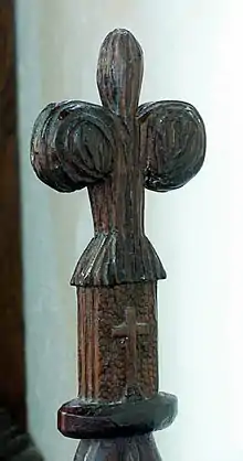 Poppyhead is a form of carving of the top of the end of a bench or a choir stall.[1] Its name is unrelated to the poppy flower. It is derived, by way of Old French, from the Latin word puppis, which means the poop or the figurehead of a ship. In its simplest, and its most usual form, it has the appearance of a stylised fleur-de-lys. In some cases, it consists of a much more intricate carving; for example in Holy Trinity Church, Blythburgh, some of the poppyheads represent the seven deadly sins.[2]