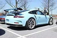 Porsche launched the RS version of the 991 GT3 at the Geneva Motor Show in 2015.[23] Compared to the 991 GT3, the front fenders are now equipped with louvers above the wheels and the rear fenders now include intakes taken from the 911 Turbo, rather than an intake below the rear wing. The roof is made from magnesium. The interior includes full bucket seats (based on the carbon seats of the 918 Spyder), carbon-fibre inserts, lightweight door handles and the Club Sport Package as standard (a bolted-on roll cage behind the front seats, preparation for a battery master switch, and a six-point safety harness for the driver and fire extinguisher with mounting bracket).