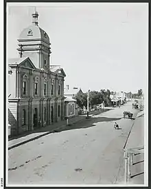 The building was severely damaged by fire in 1944, with the main hall, gallery, mayor's parlour, supper room, stage, dressing and cloak rooms, and mothers' and babies' association all destroyed. The facade, council chamber and town council office were saved.[5] It suffered a further wall collapse while being used as an open-air entertainment venue in 1945 while awaiting reconstruction.[6] It was rebuilt in 1946 at a cost of £30,000, and opened that August by Governor Willoughby Norrie.[7] The original facade was retained as part of the rebuilt town hall.[8]