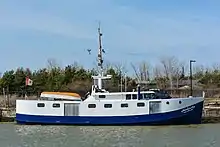 By the 1920s Port Burwell was becoming a summertime tourist destination famous for its sandy beaches, which had formed over the years as a natural result of wind and water currents interacting with the breakwaters extending out from the harbour mouth.[10] This shoreline accumulation was a well-known phenomenon which also necessitated periodic dredging to keep the harbour clear.[11] Port Burwell was also becoming a focus for natural gas drilling onshore as well as the collection point for pipelines from gas wells drilled offshore.[12] It also gained fame as the home of McConnell Nurseries, which relied upon the sandy loam in nearby farmland and the reduced frost risk near the lakefront. It developed a nation-wide mail order business for seeds and plants and for many years was the largest employer in the area.[13] The harbour's coal business changed when the Ashtabula was wrecked in a collision with a freighter in 1958, ending the railcar ferry's daily coal shipments. instead, the harbour became known for mountains of loose coal delivered by freighters for later pier-side loading into waiting railcars and transport trucks. All this was wound up after the federal government announced in 1970 it would no longer fund dredging of the harbour to support coal freighter traffic.