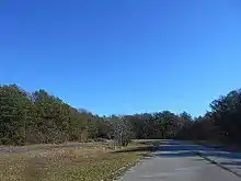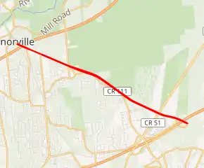 CR 111 begins at an incomplete interchange with NY 27. Currently a diamond interchange with collector/distributor roads, the intersection was originally planned as a cloverleaf with the service roads. It heads northwest through rural areas as a four-lane limited-access highway with a wide grassy median and a speed limit with 55 miles per hour (89 km/h).[4] It connects to CR 51 (East Moriches–Riverhead Road) by way of a half-diamond interchange, with an exit ramp from CR 111 south an entrance ramp to CR 111 north. Just past the junction, it crosses over a long dirt road named Toppings Path.