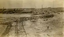 In the winter of 1912-13 the site was surveyed and construction of a wharf began in the spring, followed by buildings and other infrastructure built during the summer. The brand new Canadian research ship CSS Acadia was sent from Halifax to chart the harbour and approaches in the summer of 1913 and 1914. However the whole harbour project was fraught with problems from the start. Material shortages, labour disputes, storms, fires, and boating accidents led to major delays. Another setback was the necessity to completely redesign the harbour because the fast flowing Nelson River was building up silt on both sides of the wharf. Therefore, the harbour was changed to a small man-made island farther out in the river. The island was connected to the mainland with a seventeen-span truss bridge, built by Dominion Bridge Company of Montreal.[1] A wrecked ship currently lies on the island.[7]
