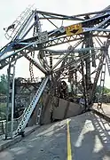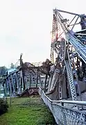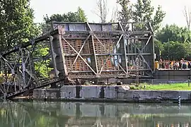 The east tower of the bridge toppled over, while the west tower collapsed in on itself. The bridge span was pushed into the water, severely deformed. The damage to the bridge was estimated as between $15 and $20 million. It was scrapped in its entirety. The removal of the towers from the canal, especially the counterweights (some 300 tons each), necessitated the use of a special heavy-duty floating crane. The canal was closed until September 9 for the repairs.