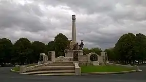 The memorial stands in the most prominent position in the centre of the village, at the intersection of its broadest avenues, The Causeway and The Diamond.[2][3] It is made in granite, with sculptures and reliefs in bronze. At the centre is a runic cross. This stands on an octagonal plinth, on which are the statues of eleven figures. There are inscriptions on the sides of the plinth. Around the plinth is an enclosure with four seating areas, and it is surrounded by a circular parapet. The parapet is broken by four flights of steps. Flanking the tops of the steps are reliefs of groups of children holding wreathes; all the reliefs are different. On each of the four sections of the parapet facing the road is a relief depicting an aspect of the services. Between the flights of steps are flower beds.[4] The monument is about 11.6 metres (38 ft) high, and overall has a diameter of about 22.4 metres (73 ft). The reliefs of children are about 161 centimetres (5.3 ft) high and those depicting the services are about 128 centimetres (4.2 ft) high.[5]