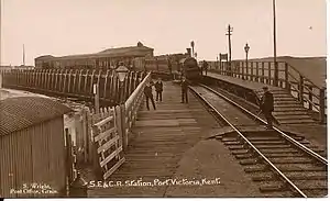 The pier was discovered to be in need of repairs in 1896, and had also been damaged by a storm in November of that year. Between 1900 and 1903, the station was heavily used, as owing to a fire Queenborough pier was unavailable for use. During World War I the Admiralty took over Port Victoria. In 1916, the railway along the pier was shortened to 93 feet (28 m) and a new station building provided, the old one being demolished. By 1931 further deterioration of the pier made it unsafe and a new station was built on the landward side.[1] The train service by this time being just two passenger services per day. In 1941 the pier was demolished and the station closed on 11 June 1951.[2] The Station featured in two Pathé News films recorded in 1939 and 1947, both featuring Station Master Stephen Mills.[3][4]