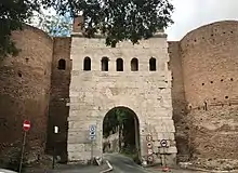 The Porta Latina (Latin - Latin Gate) is a single-arched gate in the Aurelian Walls of ancient Rome. It marked the Rome end of the Via Latina and gives its name to the church of San Giovanni a Porta Latina. Most of the present structure dates to Honorius, including the arch's voussoirs (though they are often wrongly attributed[1] to a 6th-century restoration by Belisarius, due to a cross and circle sculpted on the inner keystone, and the Chi Rho between Α and Ω sculpted on the outer keystone). The gate retained its name throughout the Middle Ages. Also nearby are the oratory of San Giovanni in Oleo[2][3] and the pagan Columbarium of Pomponius Hylas.