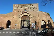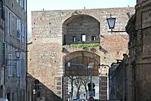 Formerly known as the Porta delle Maremme, this two story gate was first built around 1325-1326, about the time the Porta Tufi was built. It was refurbished in the 16th century by Baldassarre Peruzzi. The gatehouses and antiporti were demolished in the 19th century. The former Oratory of San Marco found near the gate is also no longer present. Above the external archway is a round christogram of St Bernardino of Siena.
