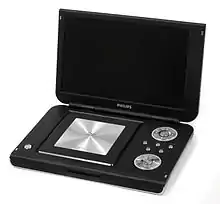 A portable DVD player is a mobile, battery powered DVD player in the format of a mobile device. Many recent players play files from USB flash drives and SD cards.[1]