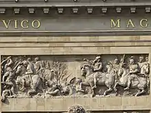 The main arch is flanked by obelisks applied to the wall face bearing sculptural groups of trophies of arms. Above the main arch, the southern face carries a sculptural group by Michel Anguier of "The Passage of the Rhine" in a sunk panel, while the north face carries allegorical figures of the Rhine and the Netherlands. The entablature bears the gilded bronze inscription LUDOVICO MAGNO, "To Louis the Great". Two smaller pedestrian walkways were built through the obelisk pedestals but they have now been closed.