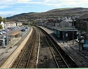 On 1 July 1876, the original station was closed, being replaced by a new one approximately 240 yards (220 m) to the east.[1] The Rhondda Fawr line to Treherbert was singled north of here in 1981 and most of the 1876 station buildings were replaced in 1984–85.[3]