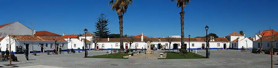 The original projects for the community never materialized in the plans of Henrique Guilherme de Oliveira.[3] Rather than a seaside settlement, the architect laid-down the settlement further to the interior, mindful of the farmers distance from their lands.[3] The square, although simple, developed from the original plans of the Pombaline-era architects that favoured a visible square grid and squares, the repetition in the facades, the volume and rhythm of the groups of buildings (including the placement of the structures, such as the church).[3]
