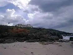 Although characterized as a "small fishing community", its move towards the tourist market has driven its growth since the 1990s.[3] Influenced by its white, fine sand beaches, natural rock-cliff shores, secluded coves and warm temperatures (water temperatures reaching a minimum 15 °C), the local economy absorves a constant number of summer visitors and foreign vacationers.[3] During the summer the population increases ten-fold with visitors, who occupy vacation homes, rented apartments and campgrounds, helped by the classification of many of its beaches as Blue Flag beaches, including the popular Praia do Espingardeiro, Praia Pequena and Praia dos Buizinhos. In front of the island of Pessegueiro is one of the more popular beaches, attracting windsurfers, boaters and sport fishermen to the waters off the coast.[3] Alongside the beach of Pessegueiro is the 17th-century fortress, partially destroyed by the 1755 Lisbon earthquake.[3] On the island of Pessegueiro, which inspired the contemporary musician Rui Veloso to pen a composition, is another 17th-century fortress, the ruins of a Roman porto and 15th-century chapel. These have also attracted visitors, as boats regularly visit the island for visits, or fishing around its waters.[3]