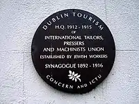 The International Tailors, Machinists and Pressers' Trade Union was founded in November 1908 (and registered in April 1909) by Jewish clothing workers hailing from the South Circular Road area. Its HQ was at 52 Camden Street (located next to the headquarters for Concern Worldwide). Aaron Klein of 14 Warren Street was its first treasurer. A later Secretary was Isaac Baker from Emorville Avenue.[28]